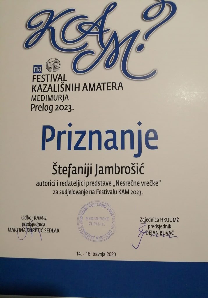– nominacija za najbolji dramski amaterski tekst – Štefanija Jambrošić