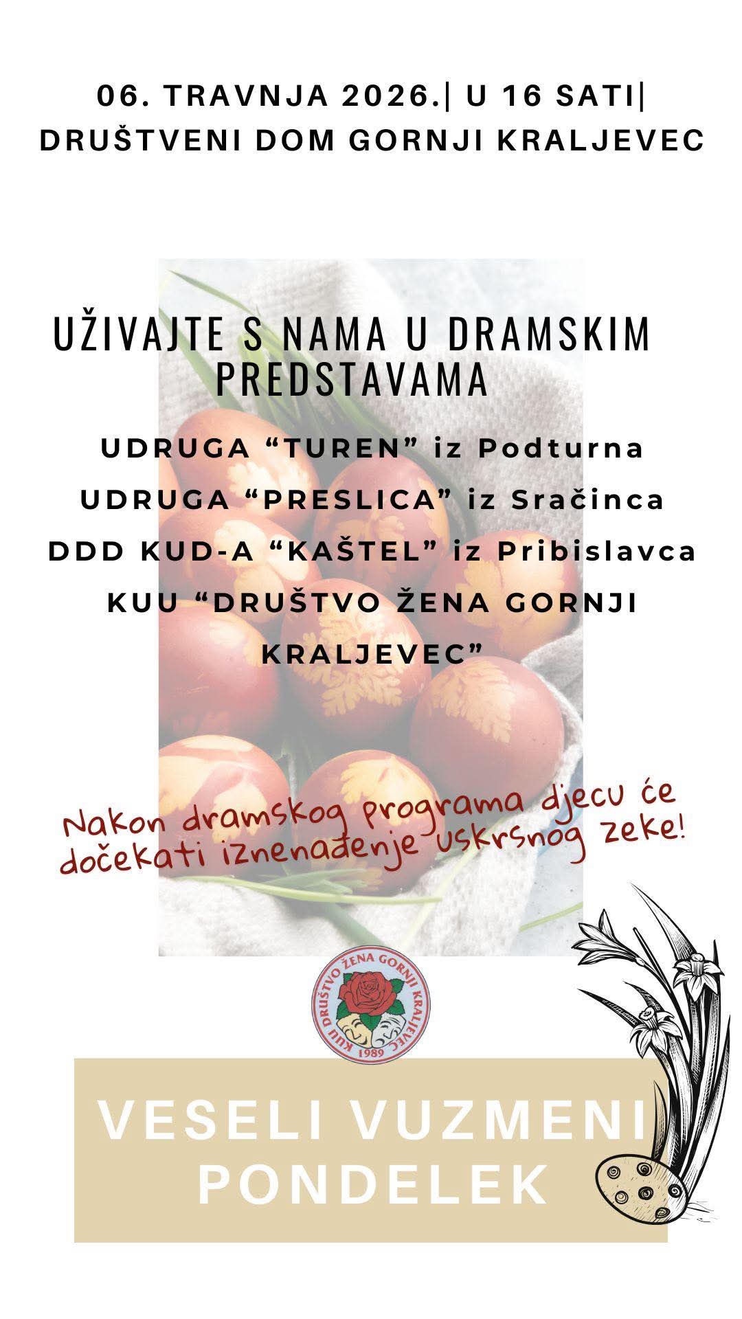 Pozivamo vas da nam se pridružite 06. travnja 2026. u 16 sati u Društvenom domu Gornji Kraljevec i uživate u zanimljivim dramskim predstavama koje su pripremila vrijedna kulturno-umjetnička društva: