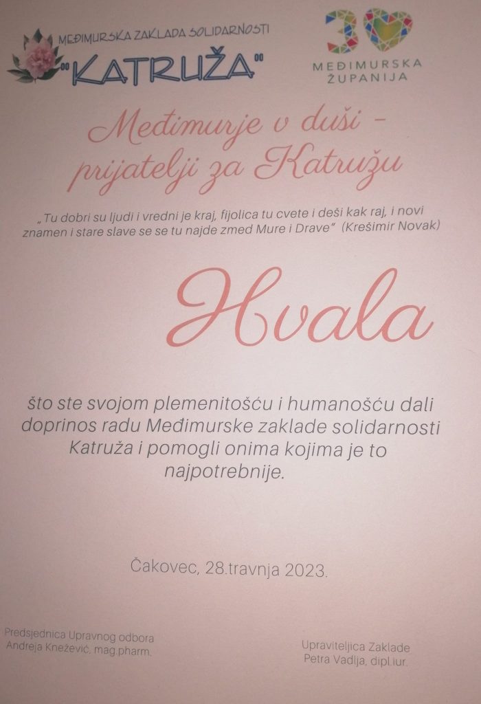 28. travnja ženska vokalna skupina počašćena pozivom za sudjelovanje na humanitarnom koncertu “MEĐIMURJE ZA KATRUŽU”, otpjevavši tri pjesme; PROTULETJE SE OTPIRA, PROTUETNO DROGO VREME I OJ TI DOMEK ZLOTI, te svojim nastupom dale doprinos radu Međimurske zakade solidarnosti Katruža